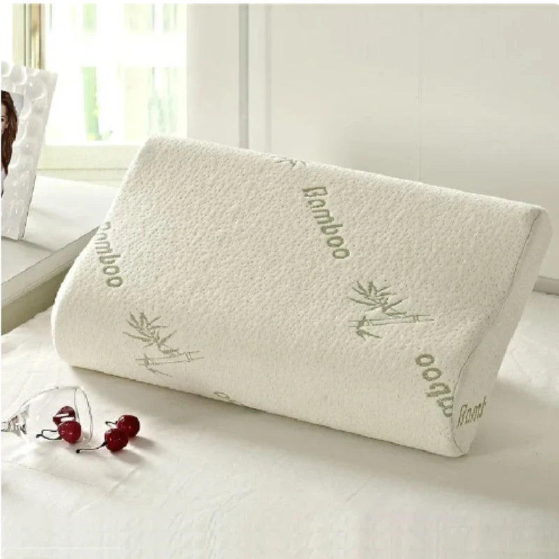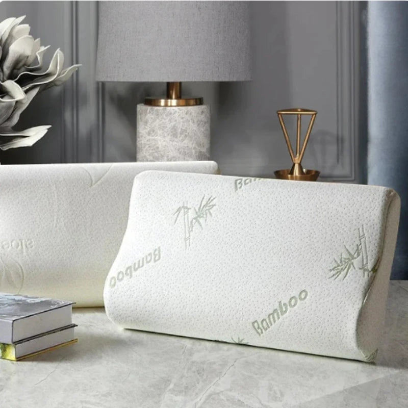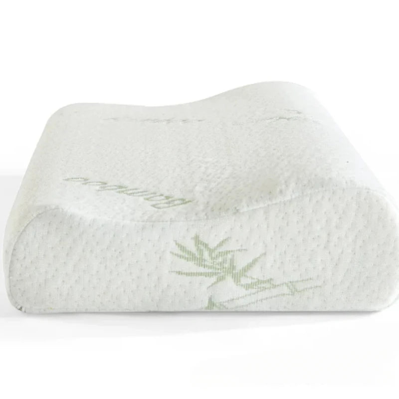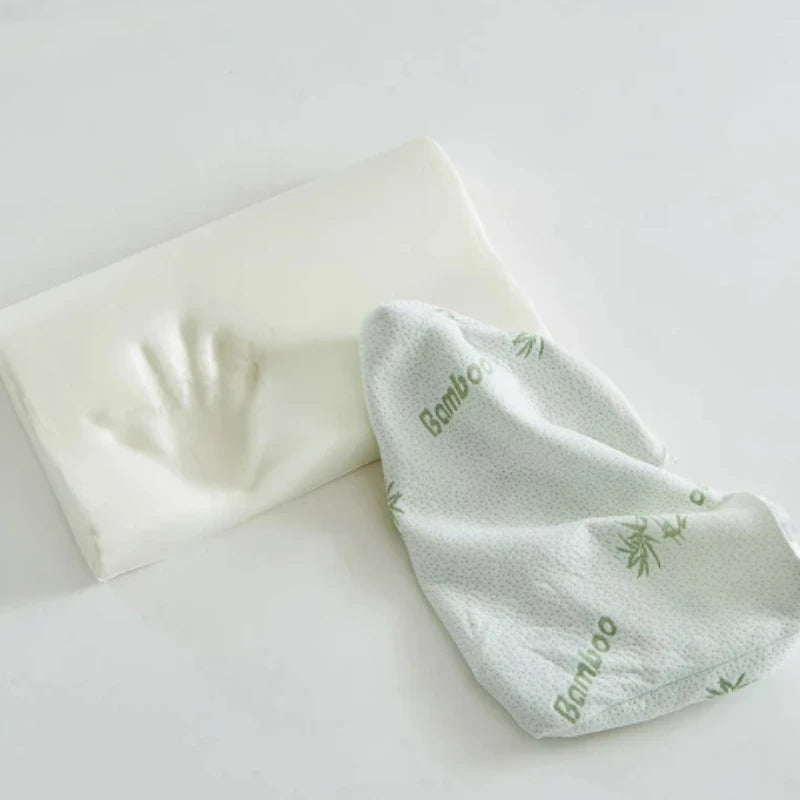 ゆるやかな波形(高低7/10cm)が首元にフィット。仰向け・横向きどちらでも自然な角度を保ち、寝起きのこわばりをやわらげます。低反発メモリーフォームがゆっくり沈み、圧力を分散します。