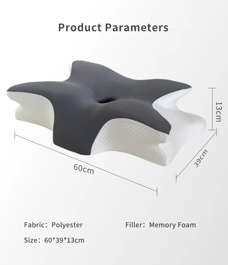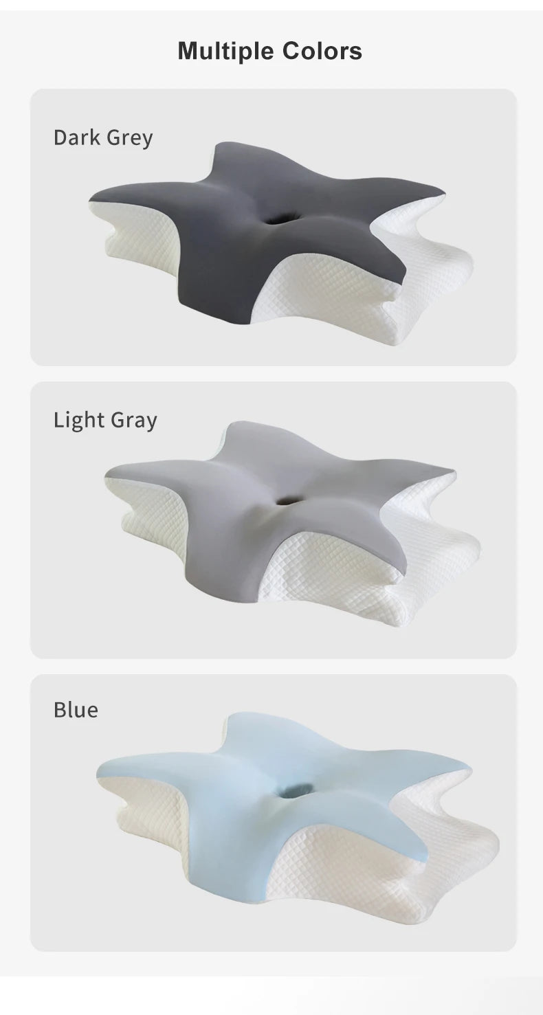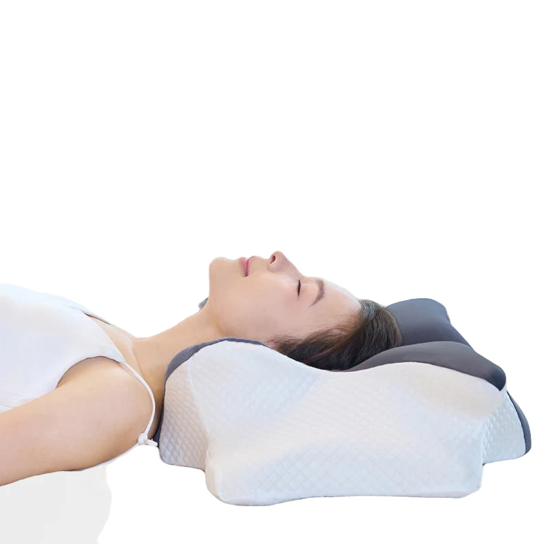 中央がやや低く、左右と首元が盛り上がった“バタフライ”形状。仰向けでは自然なカーブを保ち、横向きでは肩のスペースを確保して頭の位置を安定させます。低反発メモリーフォームがゆっくり沈み、圧力を分散します。