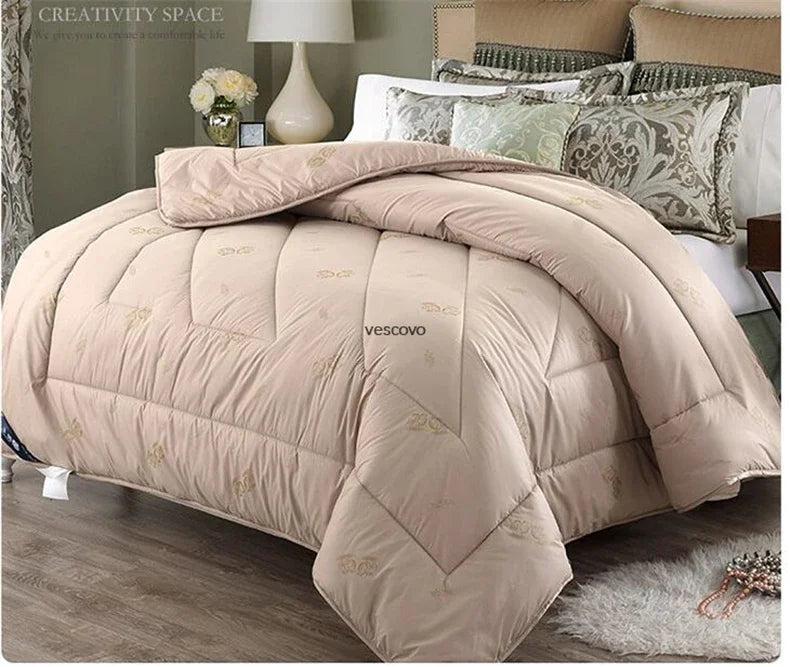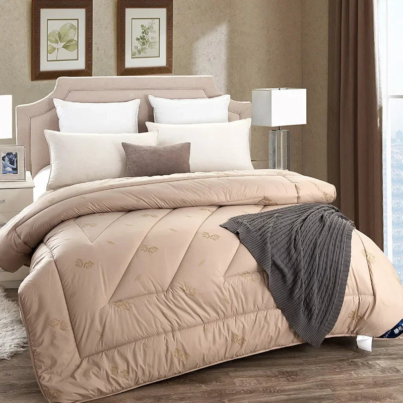 中わたに**らくだ毛(キャメルウール)**を使用。空気を含みやすく、体に沿ってふんわり。湿気をためにくいので、秋冬は暖かく、春先やエアコン下でも快適です。表地は扱いやすいポリエステル/コットン混で、毎日の寝具として取り入れやすい一枚。