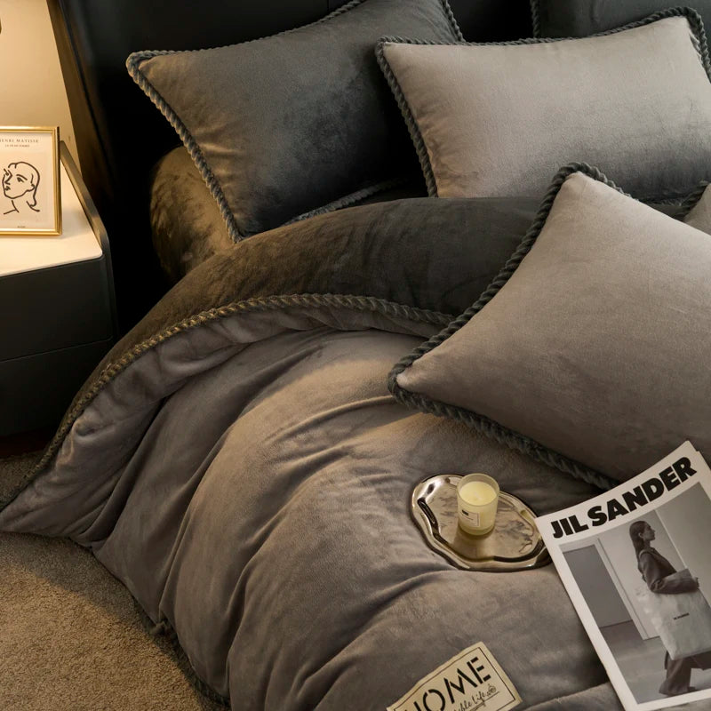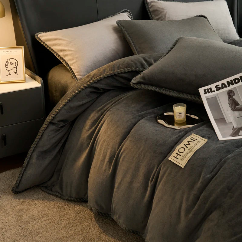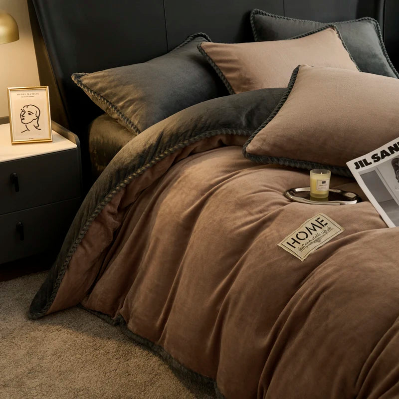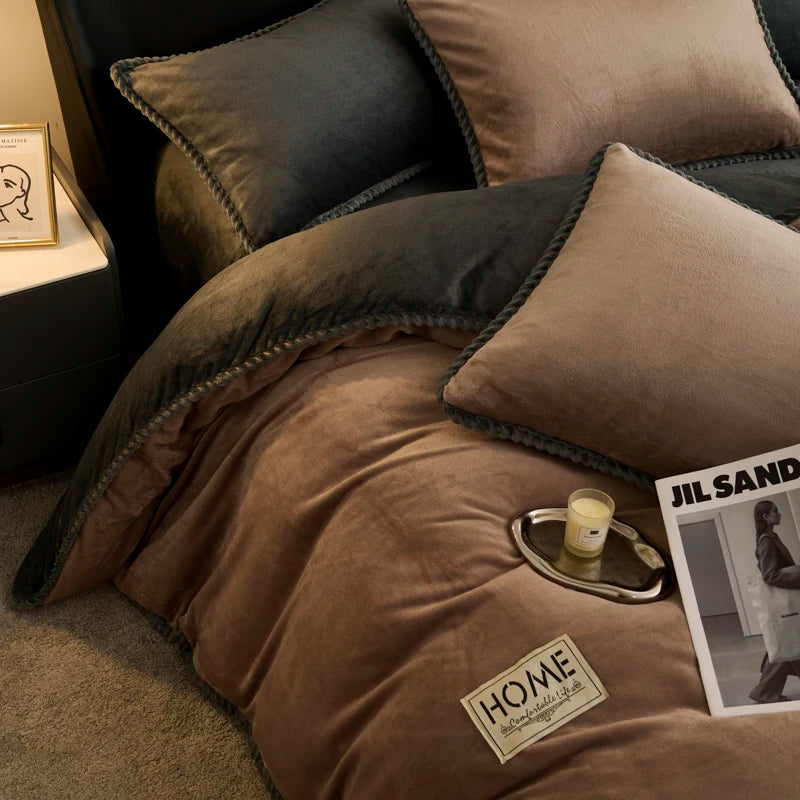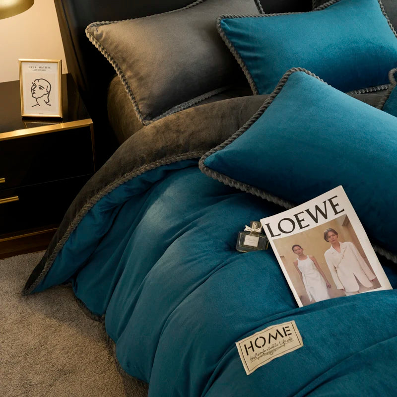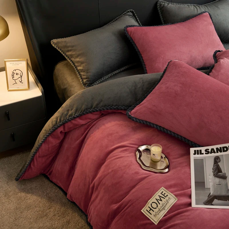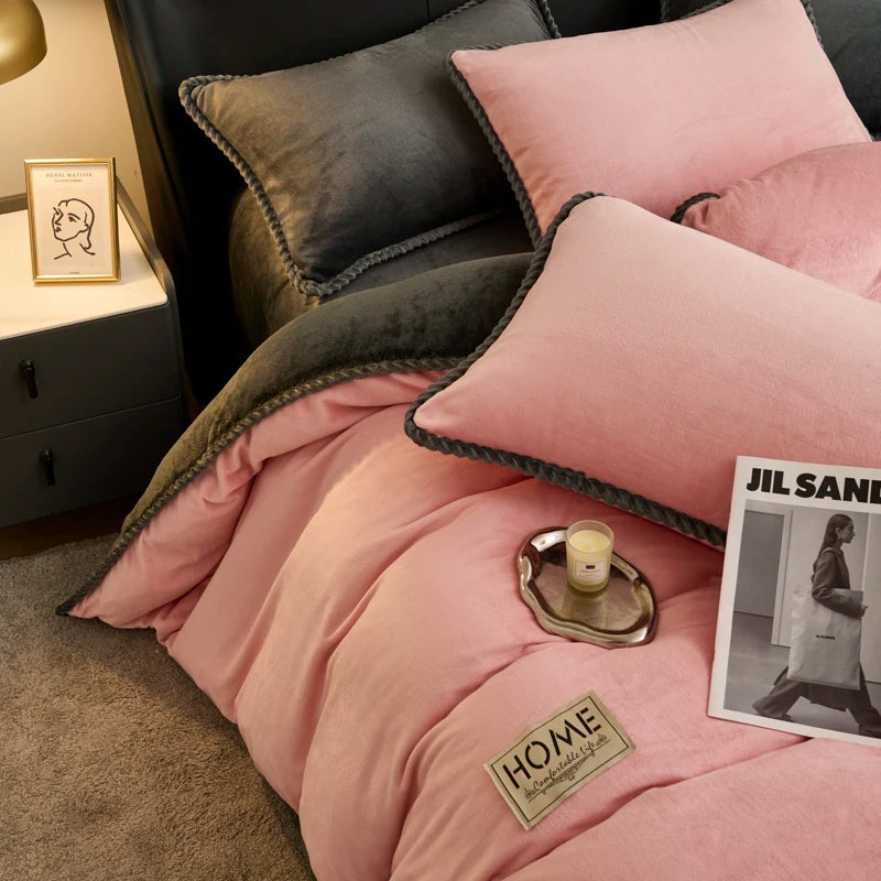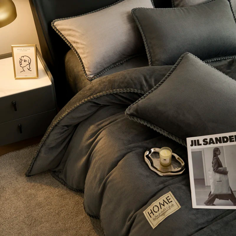 高密度の厚手フランネル(ポリエステル)を使用。毛足がやわらかく、肌に触れるたびにふんわり。ヨーロピアン調のパイピングとカラーブロックの切り替えが、寝室を上品でモダンな印象に仕上げます。