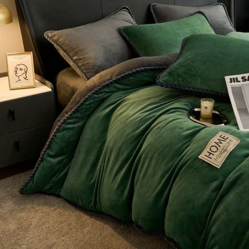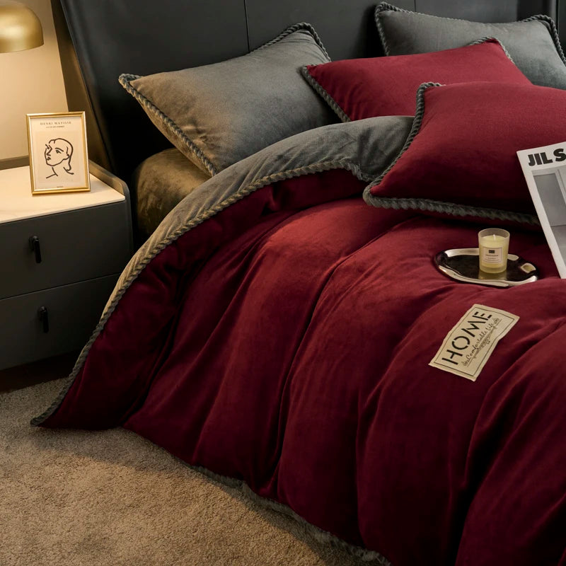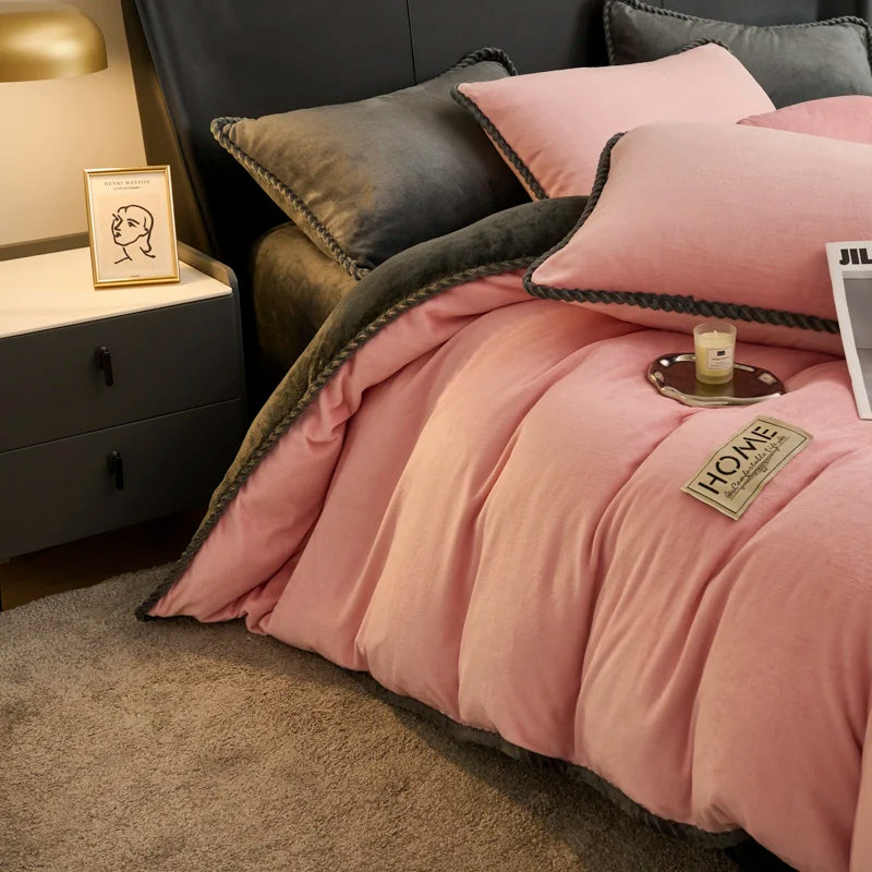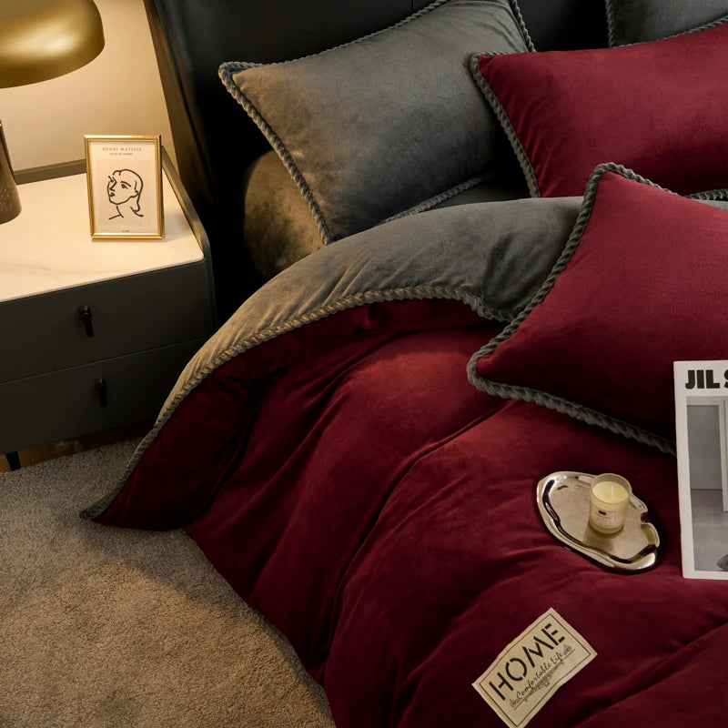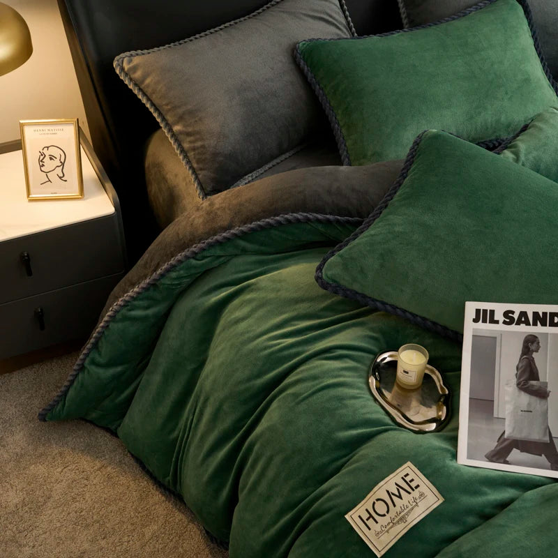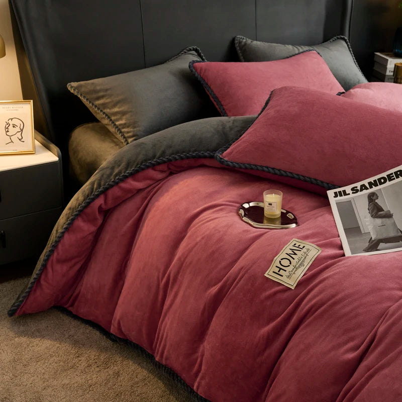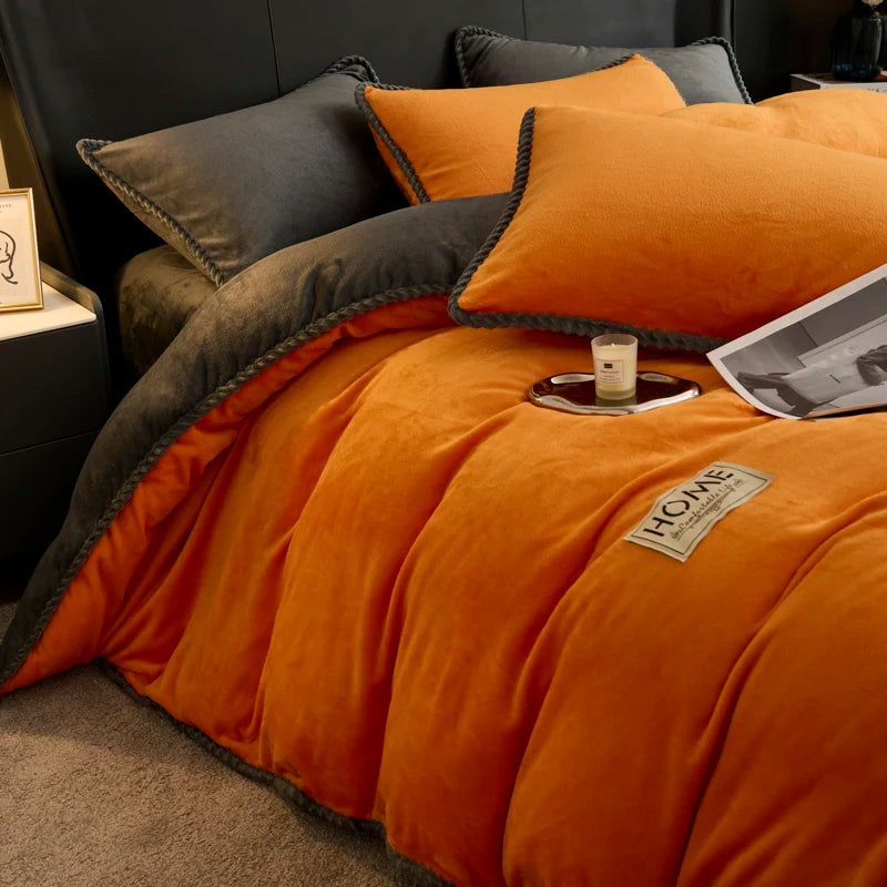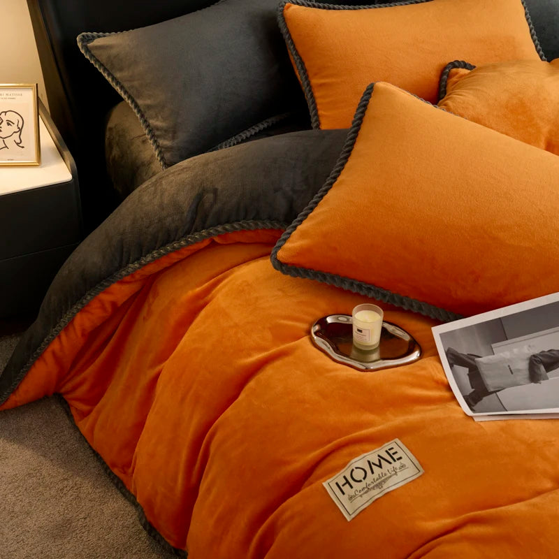 高密度の厚手フランネル(ポリエステル)を使用。毛足がやわらかく、肌に触れるたびにふんわり。ヨーロピアン調のパイピングとカラーブロックの切り替えが、寝室を上品でモダンな印象に仕上げます。